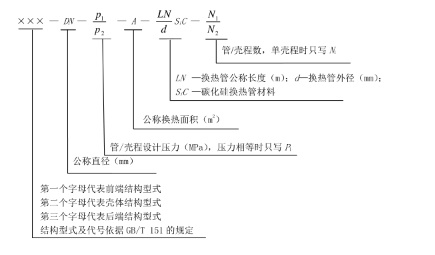 碳化硅換熱器設(shè)備型號(hào)由結(jié)構(gòu)型式、公稱直徑、設(shè)計(jì)壓力、公稱換熱面積、公稱長(zhǎng)度、換熱器外徑、管/殼程數(shù)、管束等級(jí)等字母代號(hào)組合表示。